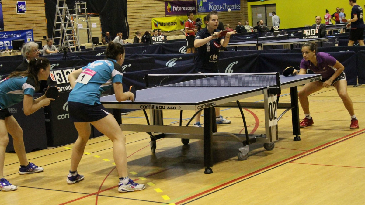 Durant trois jours (29 au 31 mai) se déroulaient les Championnats de France Minimes-Juniors de Tennis de Table. Organisé à Poitiers, ils regroupaient 23 bretons dont deux juniors du QUIMPER CORNOUAILLE TT. Camille CAMPION (N° 149, 16 ans) et Romane LE SCOUR (N° 141, 15 ans) étaient directement qualifiées dans le tableau des 16°de finale qui se déroulait le samedi 30 mai. En tant que tête de série N° 13 et N° 10, elles évitaient les phases de qualification. A 14h45, débutaient les premiers matchs au niveau 16° de finale pour les deux Quimpéroises. Camille CAMPION rencontrait Maeva CAUSSE (Boulogne Bil) et Romane LE SCOUR, Laura CARDON (Grand Quevilly). Pour leurs premiers matchs en 16° de finale les deux pongistes du QCTT se sont fait battre sur le même score 4-2. Le championnat de France en individuel s'arrêtait pour les deux Quimpéroises. Pour les doubles, Romane LESCOUR associée à MOSTAFAVI du Chesnay était éliminée en quart de finale contre la paire CHASSELIN/ZARIF. En demi finale elles retrouvaient la seconde Quimpéroise Camille CAMPION. Le duo CAMPION, associée à SOPOSKI (TTACC) se faisait éliminer sur le score de 3-0. En finale, c'est la paire CHASSELIN.P/ZARIF.A opposée à MIGOT.M/GUISNEL.O qui emportait le titre de Champion de France Double Filles Juniors.